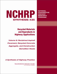 TRB’s National Cooperative Highway Research Program (NCHRP) Synthesis 435: Recycled Materials and Byproducts in Highway Applications—Reclaimed Asphalt Pavement, Recycled Concrete Aggregate, and Construction Demolition Waste, Volume 6 summarizes the results of a project that describes the experiences of transportation agencies in determining the relevant properties of reclaimed asphalt pavement, recycled concrete aggregate, and construction demolition waste and the beneficial use for highway applications.