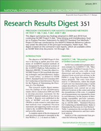 TRB’s National Cooperative Highway Research Program (NCHRP) Research Results Digest 351: Precision Statements for AASHTO Standard Methods of Test T 148, T 265, T 267, AND T 283 summarizes the findings of four interlaboratory studies conducted in 2009 and 2010 to develop precision statements for the AASHTO standard methods of measuring length of drilled concrete cores, laboratory determination of moisture content of soils, determination of organic content in soils by loss of ignition, and resistance of compacted hot-mix asphalt to moisture-induced damage.