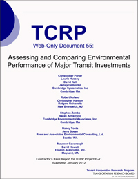 TRB’s Transit Cooperative Research Program (TCRP) Web-Only Document 55: Assessing and Comparing Environmental Performance of Major Transit Investments is the final report of the research project that was used to produce